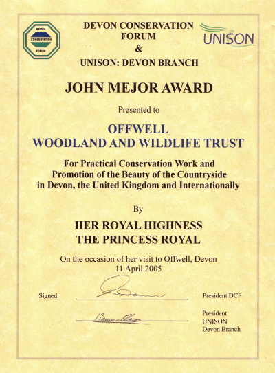 HRH The Princess Royal visited the Woodland Education Centre in East Devon, England. The Centre is managed by the Offwell Woodland & Wildlife Trust, a registered charity. Whilst at the Woodland Education Centre, The Princess Royal presented the Offwell Woodland & Wildlife Trust with the John Mejor Award for practical conservation work and promotion of the beauty of the countryside in Devon, the United Kingdom and internationally. For more information on the Royal visit and a gallery of images, click here. |