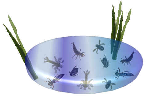 Beetle larvae and adults in the pond.