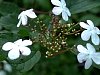 A small deciduous tree reaching 4 metres in height. The twigs are greyish and without hairs. The leaves are about 5-7cm long and have 3 or 5 sharply toothed lobes. The cluster of white flowers is about 5-10cm across, the largest flowers on the edges are sterile and will produce no fruit. The berries are red and remain on the tree after the leaves have fallen. Prefers to grow in damp woodlands. |