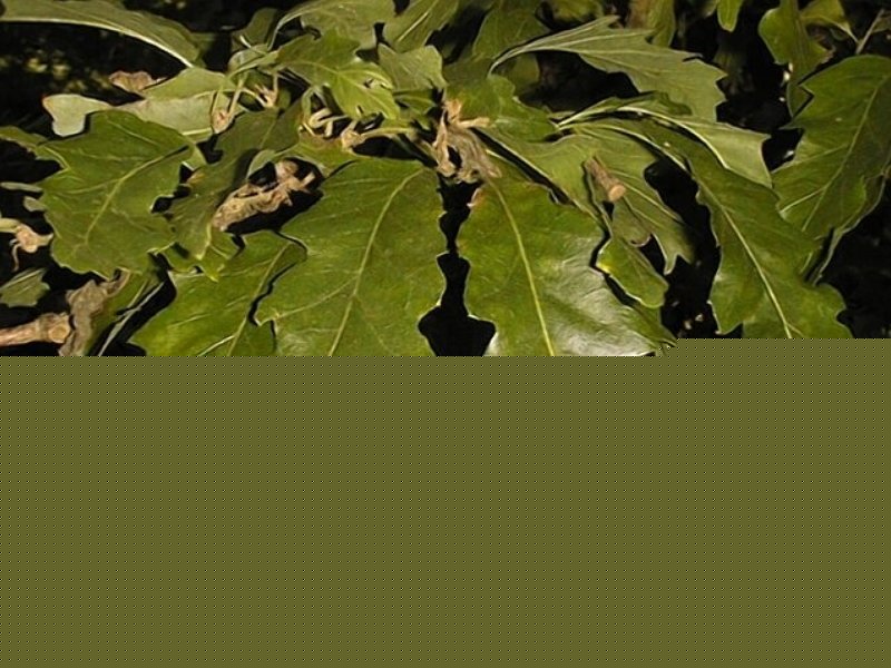 Introduced to Britain from Southeastern Europe, Turkey Oak is a tall tree with a rough, grey bark. Characteristically amongst the oaks, the leaf buds are surrounded by long filaments which remain when the leaves have opened, forming "fluffy" stipules at the base of the leaves. The leaves are dark green and fairly hairy underneath. They have lobes separated by deep notches. The acorns are situated in bristly cups with no stems. |