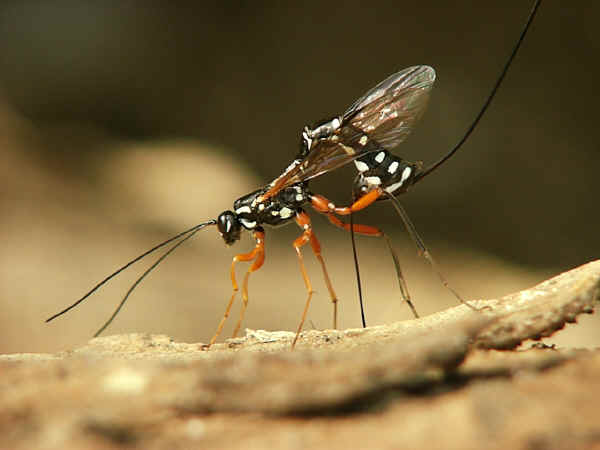 adults feed on nectar from flowers and aphid honeydew. The ovipositor of the female is used to lay eggs deep within fallen timber. The picture above shows a female preparing to lay eggs in a log on the woodland floor. The long ovipositor is 40-50mm in length. It is like a hypodermic needle and is protected inside a long black sheath. It can penetrate wood with ease despite its delicate appearance. The female is feeling the timber with the antennae on the front of her head. She is searching for the leg-less larvae of another type of wasp, called a Wood Wasp, or Horntail. She locates them deep inside the timber, just from sensing vibrations. Once she has located a Wood Wasp larva, she will drill her ovipositor down through the timber and lay an egg on the outside of the larva. It may take her as much as an hour to complete the process. She is very vulnerable to other predators, such as birds, at this time. When the egg hatches, the Ichneumon larva will gradually consume the Wood Wasp larva.