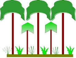 wpe5F.jpg (9401 bytes) The tallest, most mature trees form the canopy  of a woodland. The leaves of species such as Beech are so effectively patchworked and angled to catch the maximum amount of light, that they cast a very dense shade. This allows few plants to survive underneath. Ash, by contrast, with its finely divided leaves, allows more light through to the woodland floor, so that layers are more likely to develop.